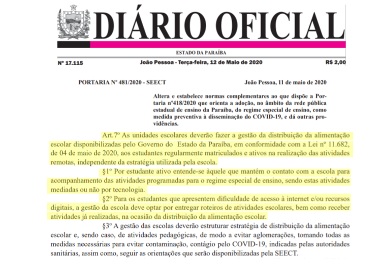 Somente quase dois meses após a suspensão das aulas presenciais, o governo da Paraíba anunciou a distribuição de cestas básicas em atendimento à lei estadual que visa garantir a segurança alimentar dos/as estudantes. E agora, além de toda demora do governo para tratar do problema, identificamos uma medida absurda na portaria n. 481/2020, assinada pelo Secretário Cláudio Furtado no dia 11/05: a restrição da distribuição da alimentação escolar apenas para os/as estudantes considerados “ativos” na realização das atividades remotas.